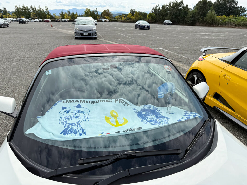 せっかくですので愛車のダッシュボードにコラボグッズや持ってきたウマ娘グッズでちょっとした飾付け。